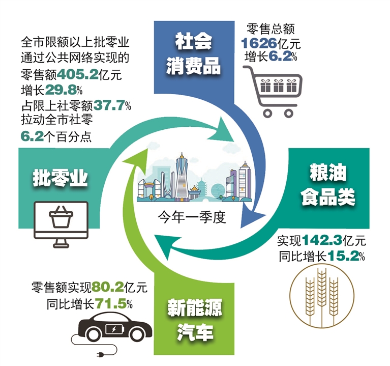 线上零售、重要消费品零售表现抢眼,保持快速增长态势。全市限额以上批零业通过公共网络实现的零售额405.2亿元,增长29.8%;粮油食品类和日用品类商品零售额分别实现142.3亿元和85.4亿元,同比增长15.2%和15.5%;新能源汽车零售实现零售额80.2亿元,同比增长71.5%。