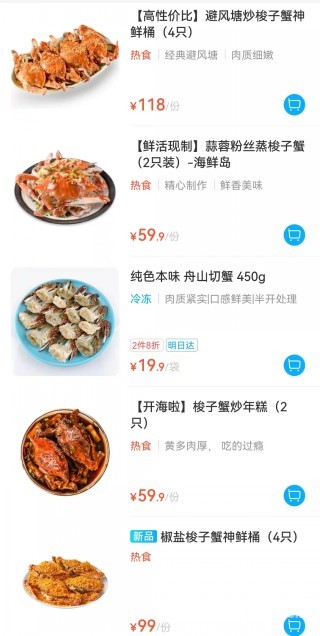 除了农贸市场与超市,电商平台也成为了年轻人购菜的渠道之一。在叮咚买菜平台上,标注了原产地为浙江舟山的鲜活梭子蟹价格为49.9元一份,每份约500克。而在盒马APP上,单只2-3两重的梭子蟹售价为49元一斤,还提供避风塘炒梭子蟹、蒜蓉粉丝蒸梭子蟹、梭子蟹炒年糕等鲜活现制的餐饮熟食。