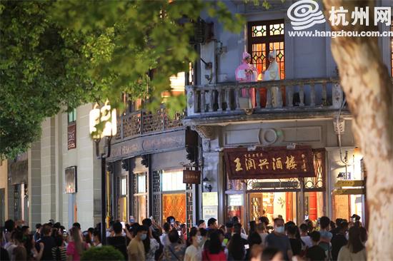 御街四拐角处,历史建筑的阳台上演戏曲会,重现勾栏瓦肆的热闹场景;鼓楼小广场,与区文化馆合办的宋韵大秀场2.0再度上演,国风表演也精彩纷呈,烘托中秋氛围。大家穿行在街区,一边赏月,一边热闹听曲赏舞,通宵不绝,热闹非凡。