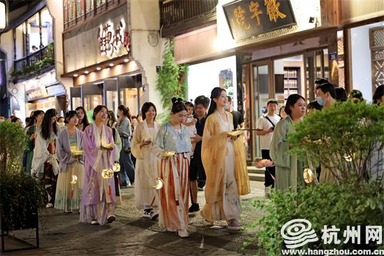 此外,中秋期间,身着汉服的“宋人们”提着不同类型的花灯游走清河坊街区,从达官贵人到市井百姓,市民游客随时随地与“古人”擦肩,沉浸式感受热闹中秋夜。鼓楼还设有帷幔,将花灯悬在高处再现“竖中秋”的习俗,供市民游客拍照打卡。