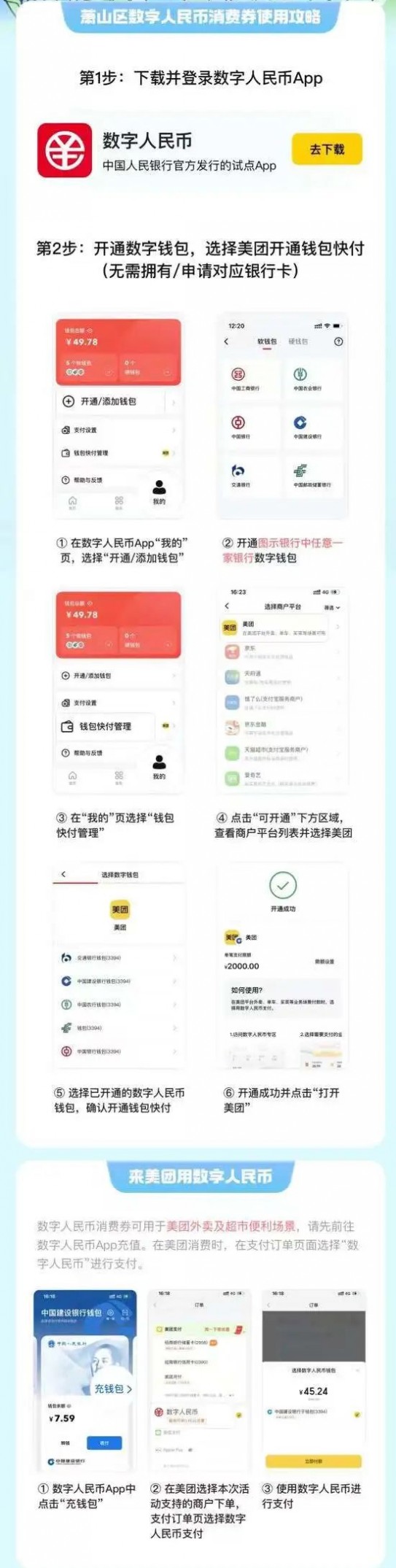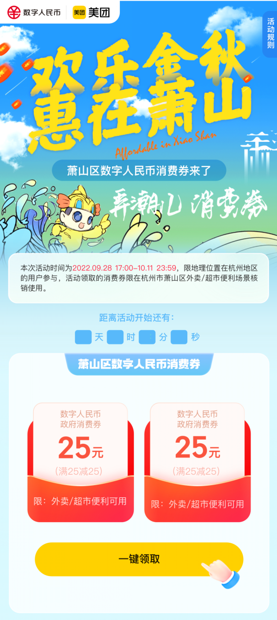 此次发放的数字人民币消费券共设券包2万个,每个券包总价值50元,共计100万元。活动面向杭州市消费者开放,即在领取消费券时的实时地理位置定位为杭州市的消费者均可参与。领取消费券前,消费者需要开通数字人民币钱包,并将子钱包推送至美团。消费者可在美团App搜索“萧山数字人民币消费券”进入“杭州市萧山区数字人民币消费券”活动页面,点击领取,一键领取券包,每人限领一次。