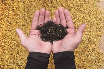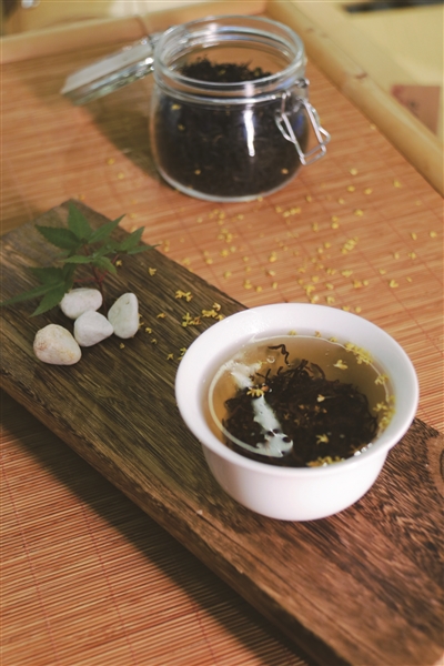 于是,他用了一年的时间和经销商沟通,获取终端顾客反馈,不断调整生产工艺。他把传统的竹框换成了定制的不锈钢框架,又反复试验石灰窨制的时间,不但使得生产环节更加卫生可控,也让茶叶中原本有些发红发黑的桂花,变得像鲜桂花一般金黄。开水一泡,琥珀色的茶汤中,点缀着点点金黄,煞是好看。