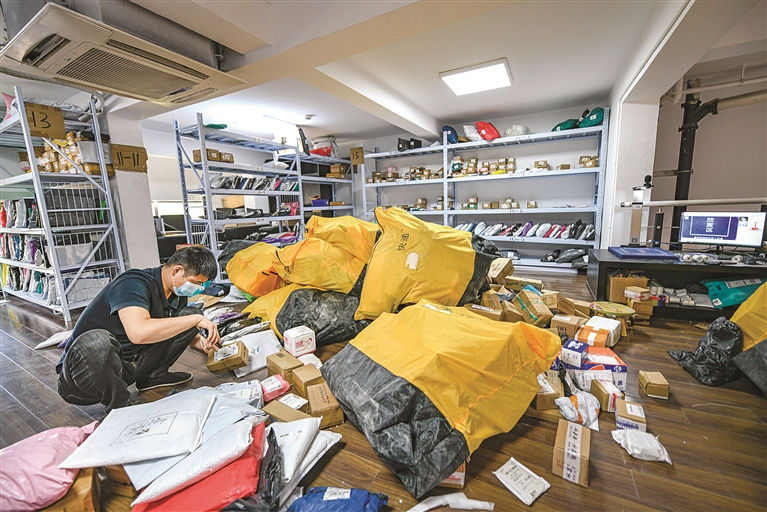 作为下半年促销力度最大的购物节,今年的“双11”已于10月下旬开启了预售,快递的第一波高峰已经到来。图为北干街道一家快递公司内,大量的快递包裹已经送达站点,快递员正在忙着分拣录入。
